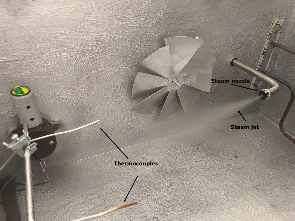 Image from our proof-of-concept experimental setup, showing a nozzle—a device designed to direct and control the flow of a fluid—used to create a focused steam jet aimed at heated thermocouples, which then detected the presence of the steam.
